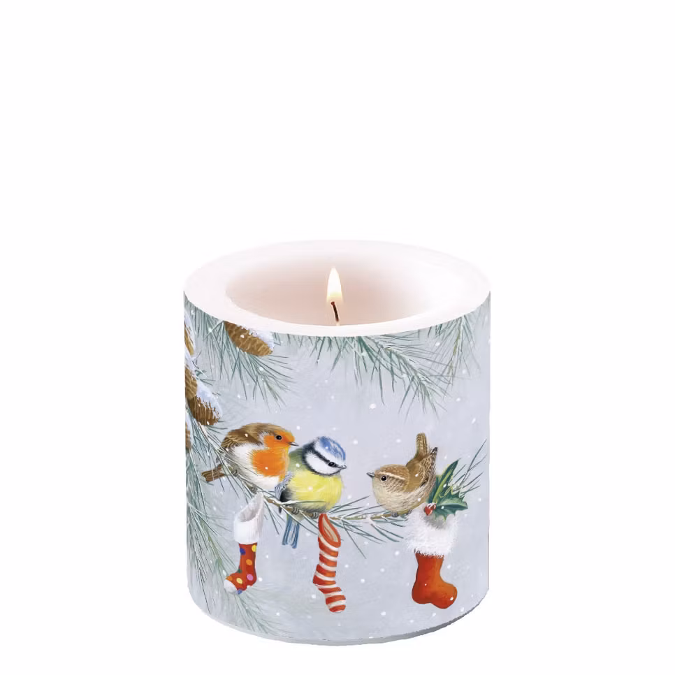Dekorljus med vackert vintermotiv med söta fåglar på en snöig tallgren med julstrumpor. Från Ambiente.