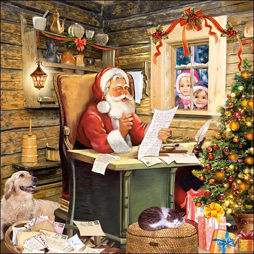 Servett i bra kvalitet från Ambiente. Tomten jobbar på med sin post med önskelistor i sällskap av sin hund och sin katt. Fin, präglad bårdkant. Innehåller 20 st servetter, 3 lager.