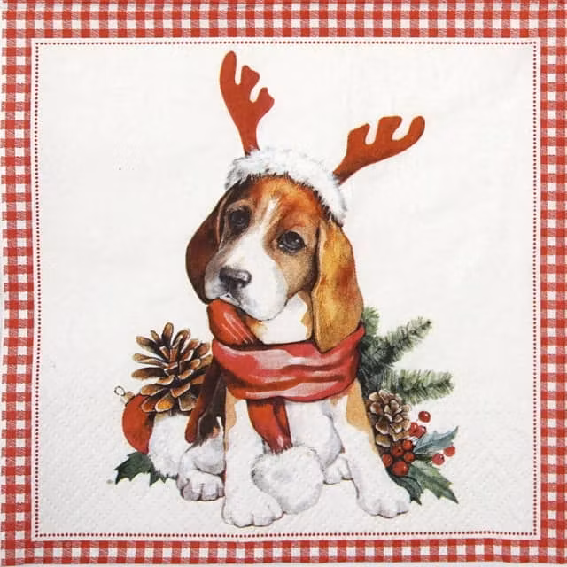 Lunchservett från Paw Decor Collection i bra kvalitet med fint julmotiv med en beagle med luva. Fin, präglad bårdkant.