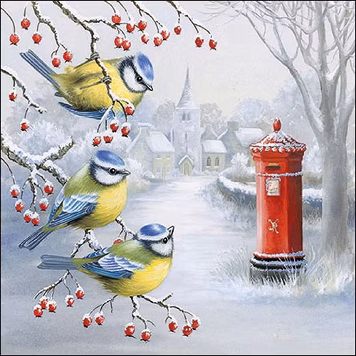 Kaffeservett i bra kvalitet från Ambiente. Fint vintermotiv med söta blåmesar som sitter och håller koll på den röda brevlådan. Fin, präglad bårdkant.