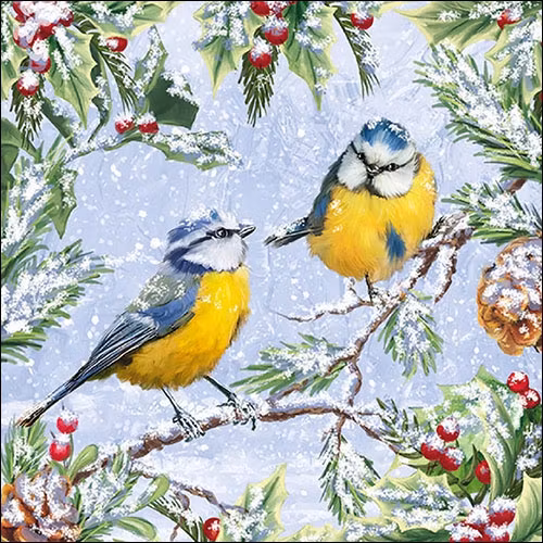 Servett i bra kvalitet från Ambiente. Ett fint motiv med två blåmesar med lite snöpuder på sig. Fin, präglad bårdkant.