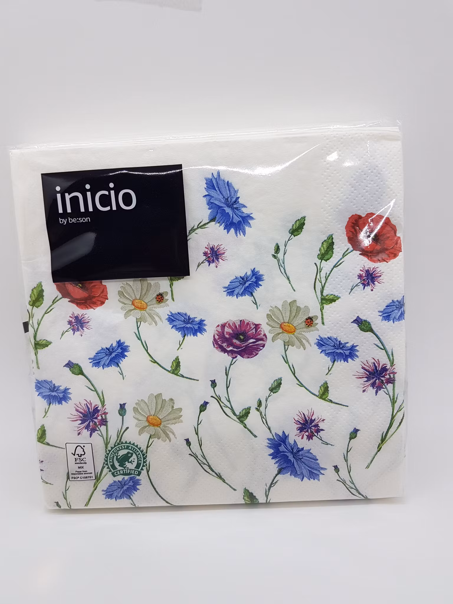Lunchservett i bra kvalitet från Inicio. Härliga sommarblommor - prästkrage, blåklint och vallmo. Fin, präglad bårdkant.