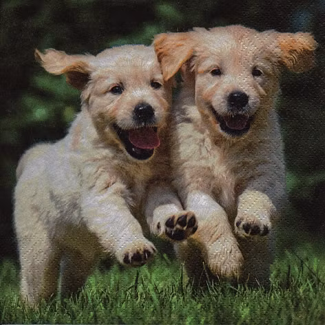 Söta servetter med hundvalpar på språng. Innehåller 20 st servetter, 3 lager.