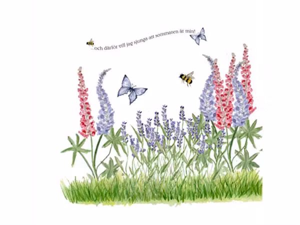 Fin sommarservett med blommor och sommarvisetext ..... och därför vill jag sjunga att sommaren är min - originaldesign Camilla Ståhl.