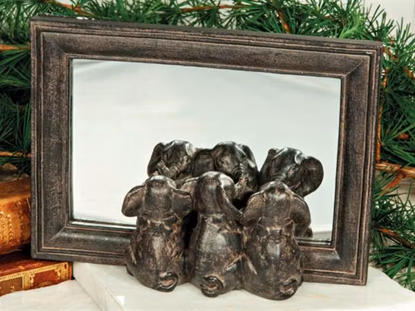 En fin inredningsdetalj i form av en spegel där tre små elefanter sitter och speglar sig. Passar som present till både liten som stor.
