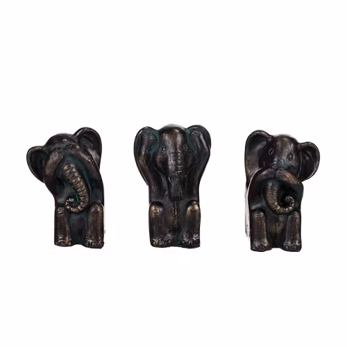 Jättesöta elefanter i poly i känt tema "inte se, inte höra, inte tala". Motivet förknippas med det japanska mottot att ”inte se (något ont), inte höra (något ont), inte säga (något ont)”, ett motto som ger uttryck för en buddhistisk tanke om att den som inte exponeras för ondska inte heller kommer att reflektera denna ondska i sitt tal och sina gärningar.