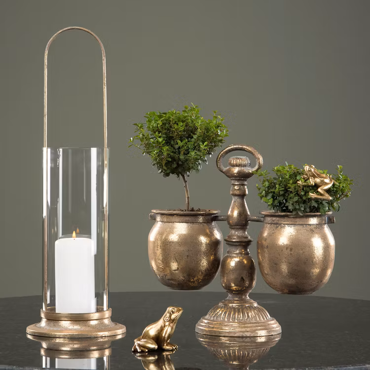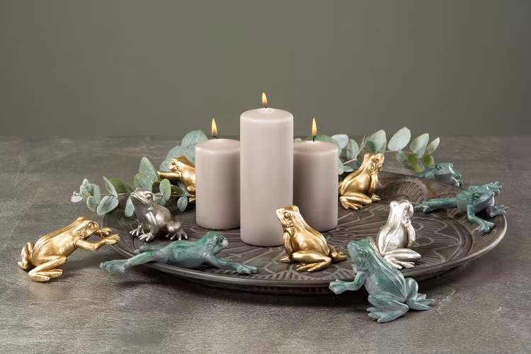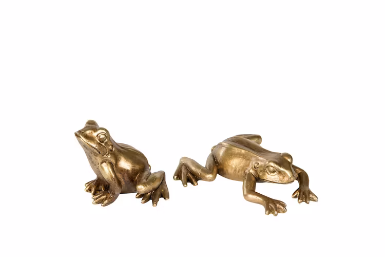 Söta grodor i guldfärg för dekoration, en sittande och en liggande. Säljes i 2-pack.