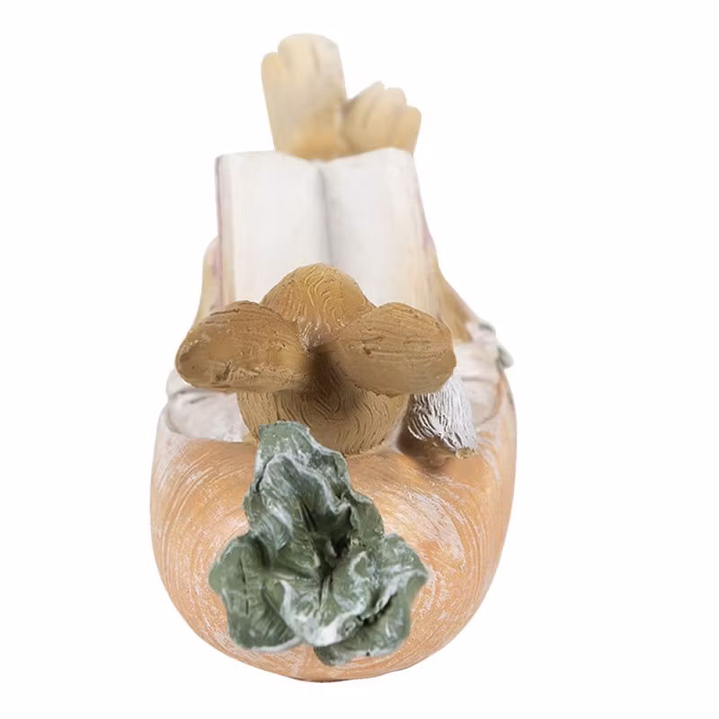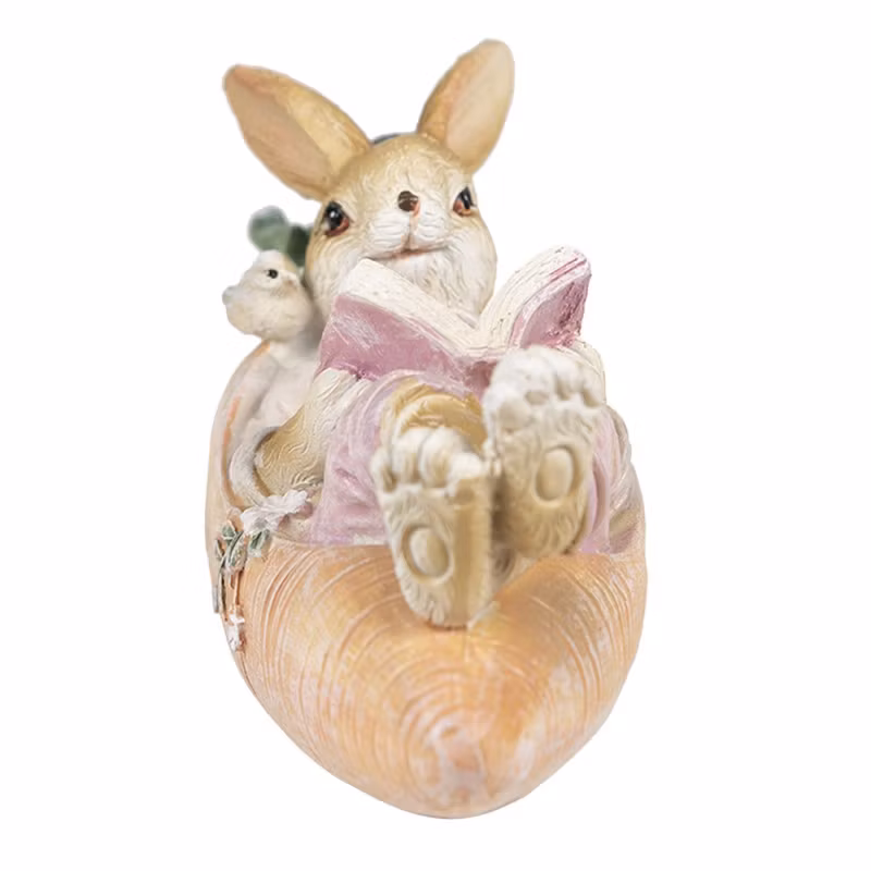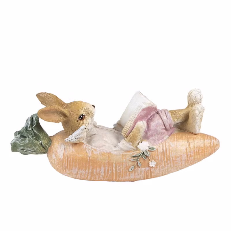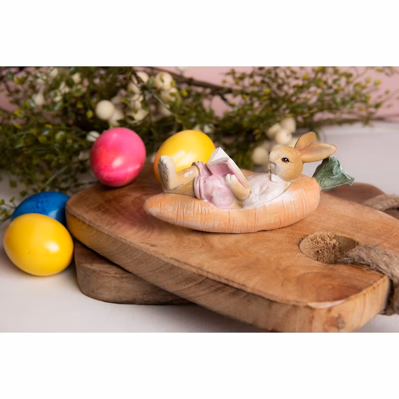 Söt liten kanin som ligger i sin morotsbåt och läser. Fint påskpynt eller varför inne ha dem framme hela året som dekoration! Fina detaljer.