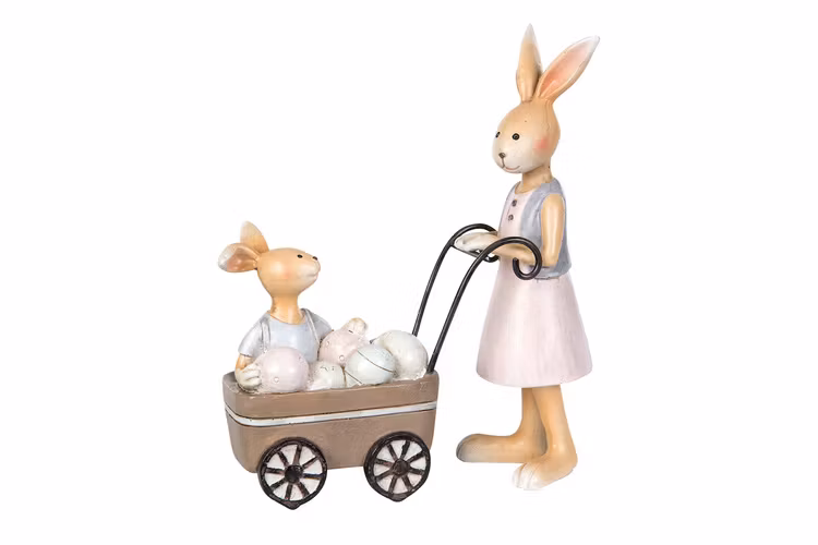 Sött påskpynt i fina pastellfärger. Kaninmamma med unge i barnvagn.
