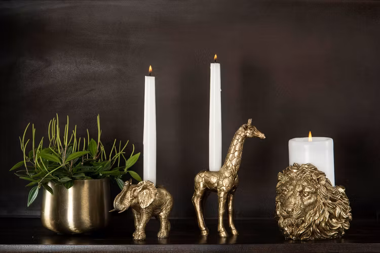 En ljusstake för kronljus i form av en elefant i i guldfärg. Inredningstrenden med djur fortsätter.