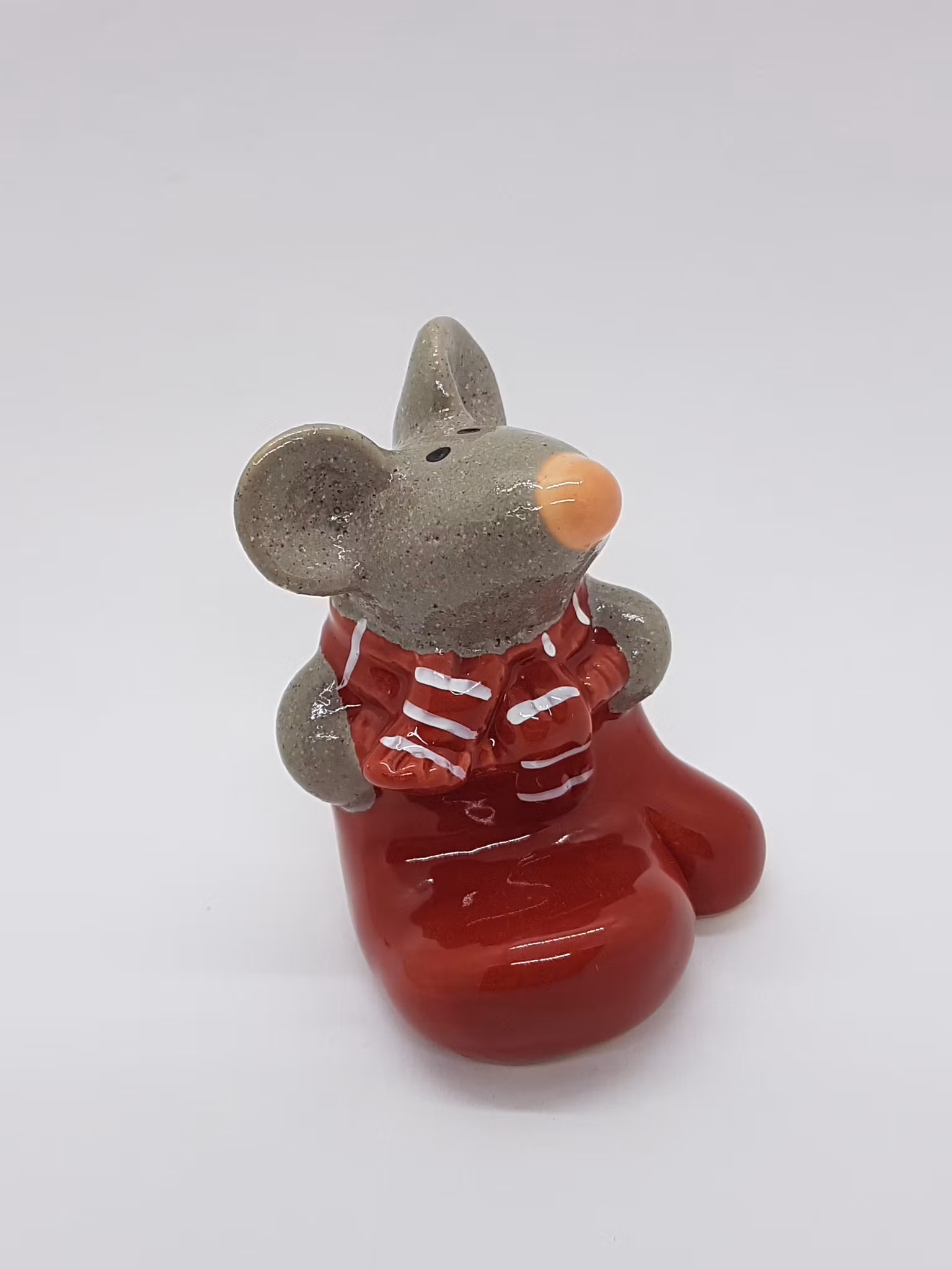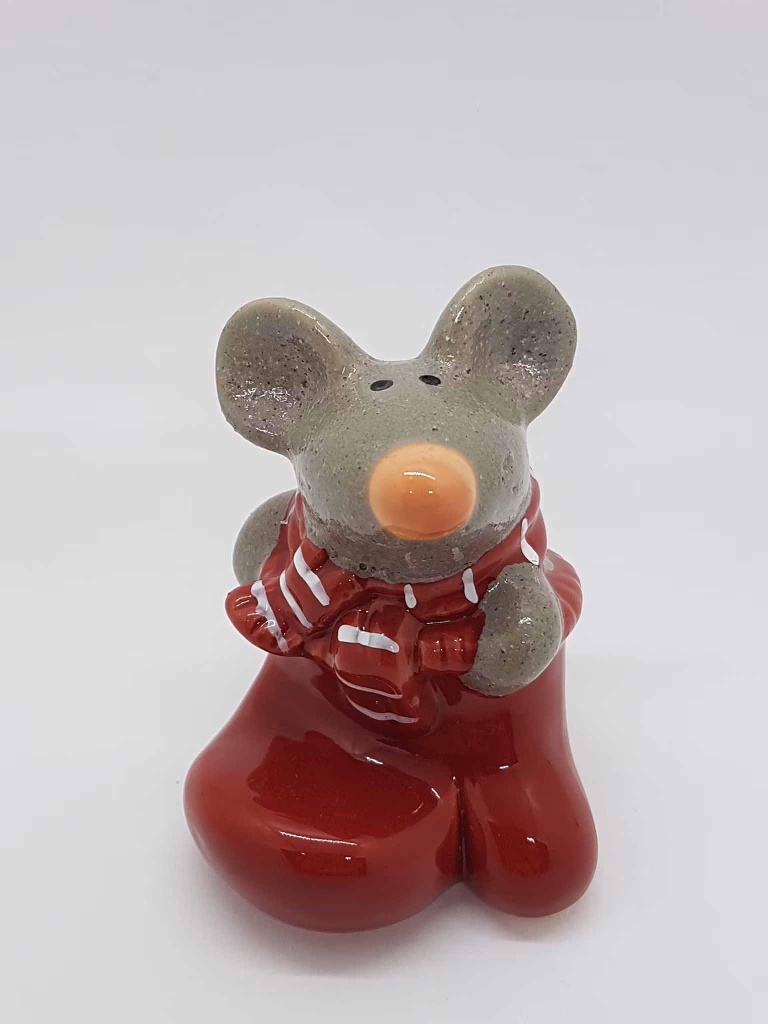 Sött julpynt! En liten mus med röd-vitrandig halsduk som har krupit ner och satt sig i en röd vante.