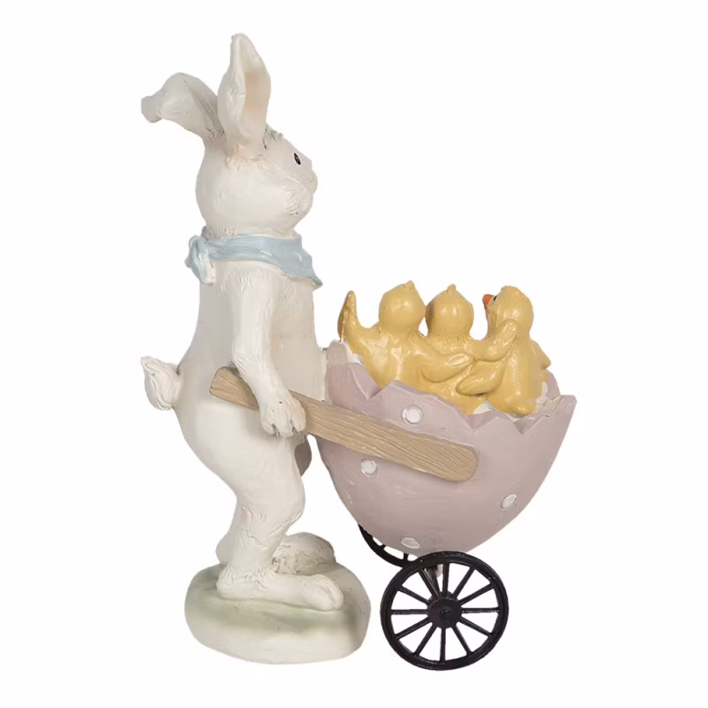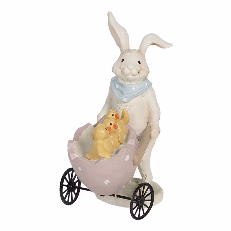 Kanin som är ute och kör ett gäng kycklingar i sin äggkärra. Fint påskpynt eller varför inne ha dem framme hela året som dekoration!
