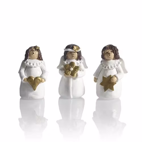 Söta små sjungande änglar i vita klänningar med detaljer i guldfärg.